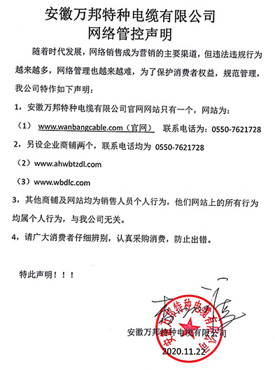 鄭重聲明:安徽萬邦特種電纜有限公司官方網站為:www_wanbangcable_com.czbjn.cn,除此之外無任何子網站或合作網站,其余均為假冒偽劣。電話:0550-7621728 13485756353 地 址:安徽省天長市滁州高新技術產業開發區經四路29號